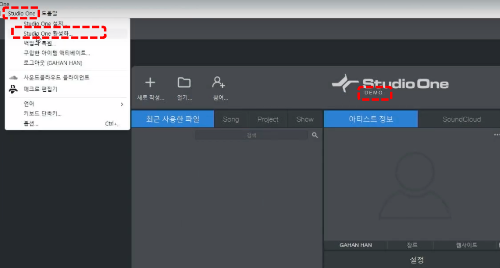지금 이 상태는 스튜디오원 30일 데모버전이고, 좌측상단 Studio One 메뉴에서 [Studio One 활성화를] 눌러서 [Run Studio One Prime]을 선택해서 활성화해 주면 프라임 버전으로 바뀌어서 구동됩니다.