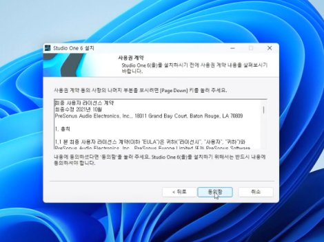 스튜디오 원 6부터는 한글이 공식적으로 지원되니 한글을 선택해 주시고, 다음, 동의함, 설치를 눌러주면 설치가 됩니다.