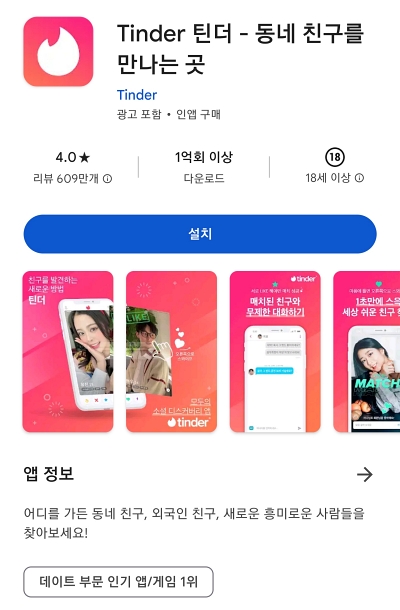 1억 회 이상 다운로드 된 현재 데이트 부분 인기 앱 1위입니다.