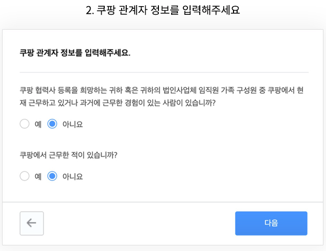2.쿠팡 관계자 정보를 입력하고 [다음]을 눌러주세요.