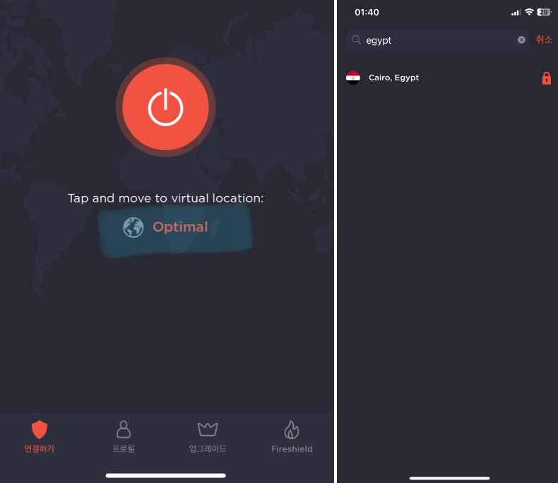 Optimal에 이집트 설정됐는지 확인하고 주황색 전원버튼 누르면 VPN이 실행됩니다.